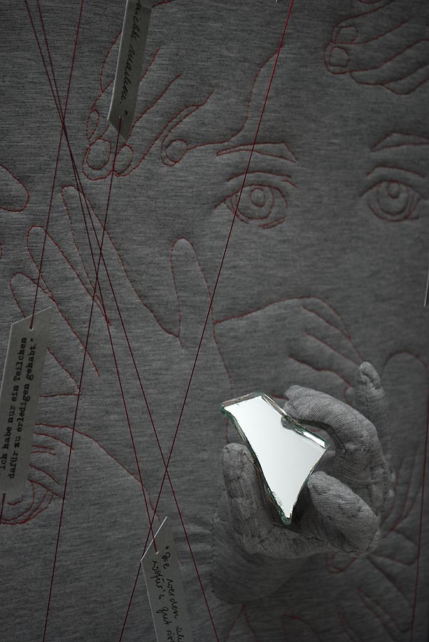 Bauwolljersey, wattiert, bestickt, Stahldraht, Schrift auf kaschierter Pappe, Spiegel