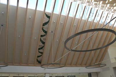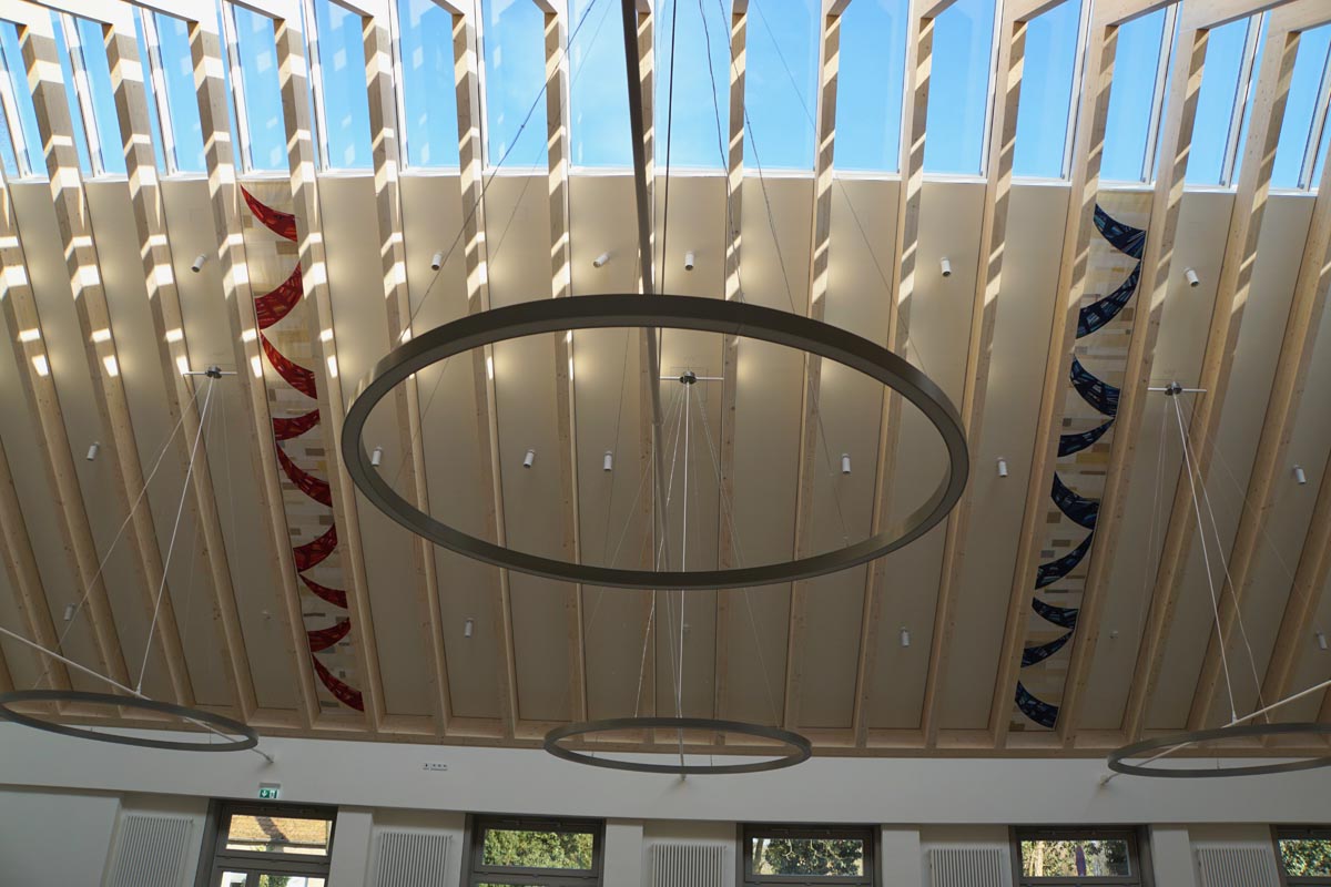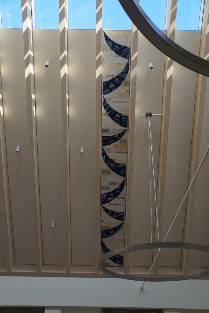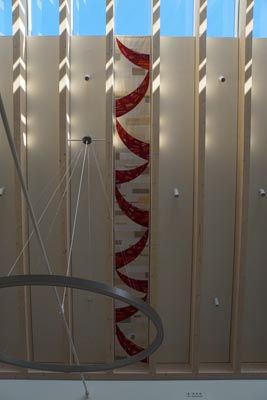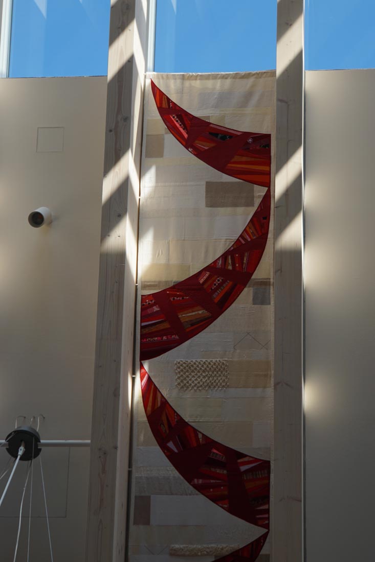 Die gespendeten Kleidungstücke wurden farblich sortiert, aufgetrennt und in Streifen geschnitten. Unter Mitarbeit von neun Kleinmachnowerinnen stellte die Textilkünstlerin Anke Mühlig aus diesem Material drei Banner zusammen, die im neuen Kirchsaal in die Deckenkonstruktion integriert wurden. Über den ganzen Dachfirst des vom Architektenteam Prof. Löffler/ Kühn entworfenen Gebäudes zieht sich ein Lichtband, das den Blick bis hinaus gen Himmel ermöglicht. Das textile Triptychon führt, wie drei Himmelsleitern, die Aufmerksamkeit hinauf zum alles überspannenden Firmament.